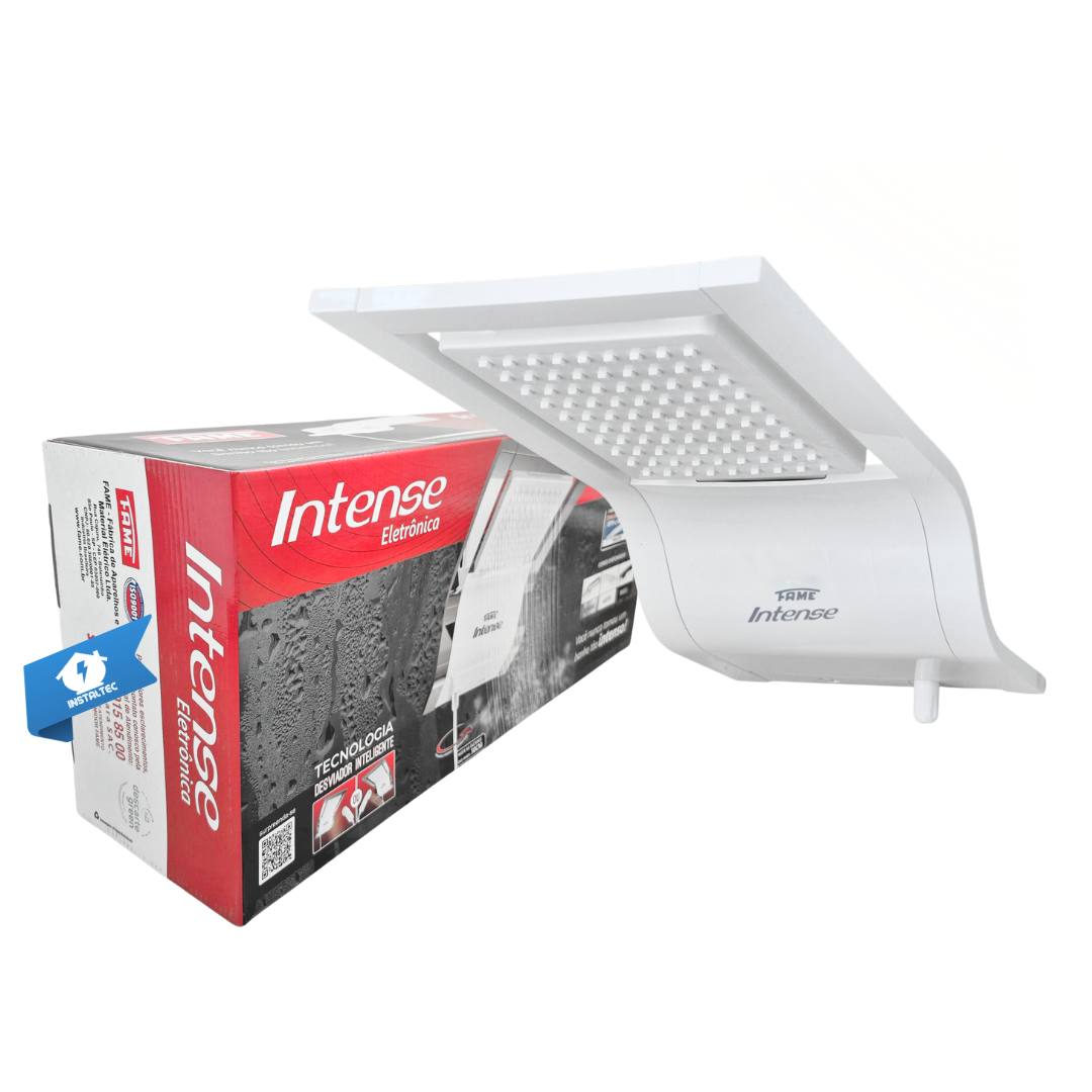 A Ducha Intense Eletrônica White da Fame entrega um banho envolvente e funcional com design moderno e acabamento branco sofisticado. Possui um espalhador projetado para oferecer um máximo volume de água. além de contar com um controle eletrônico de temperatura por haste removível. que proporciona ajuste prático mesmo durante o banho. O desviador inteligente garante alternância simples entre jato principal e ducha manual. com muito conforto. É um modelo que alinha modernidade. praticidade e eficiência térmica para o seu dia a dia.