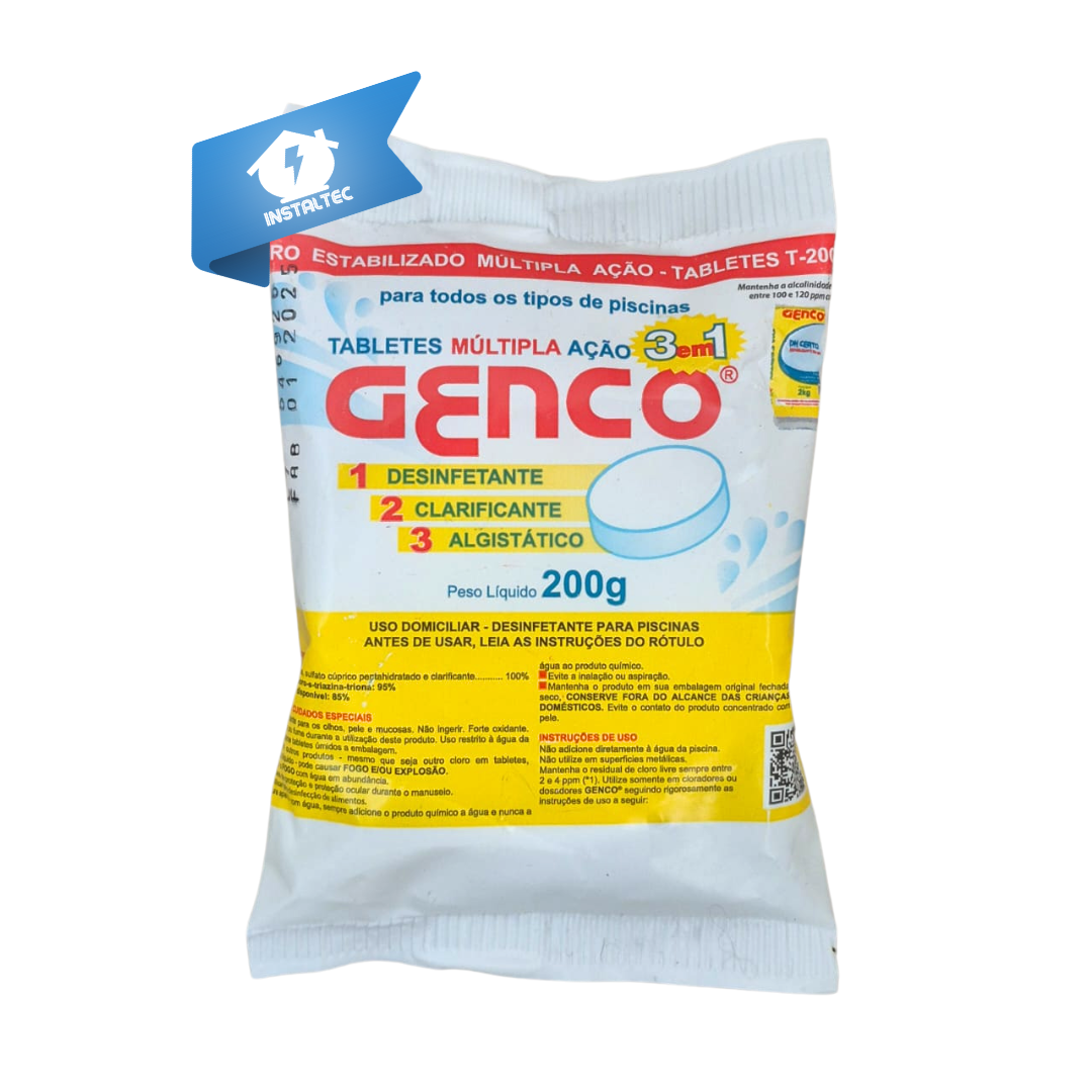 O Tablete Múltipla Ação 3 em 1 Genco 200g é a solução ideal para quem deseja praticidade no tratamento da piscina. Com apenas um produto. você cuida da desinfecção. prevenção de algas e clarificação da água. Seu formato em tablete de dissolução lenta garante ação contínua e eficaz por vários dias.