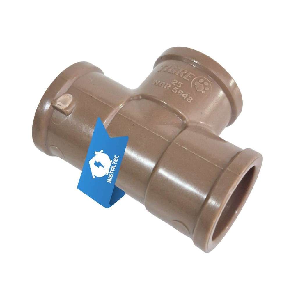 O Tee Soldável LL 25mm Tigre é utilizado em sistemas de água fria sob pressão. permitindo a criação de derivações em 90° de forma prática e segura. Produzido em PVC rígido marrom. é altamente resistente e possui alongamento nas extremidades (modelo LL). o que assegura melhor encaixe e vedação perfeita após a soldagem.