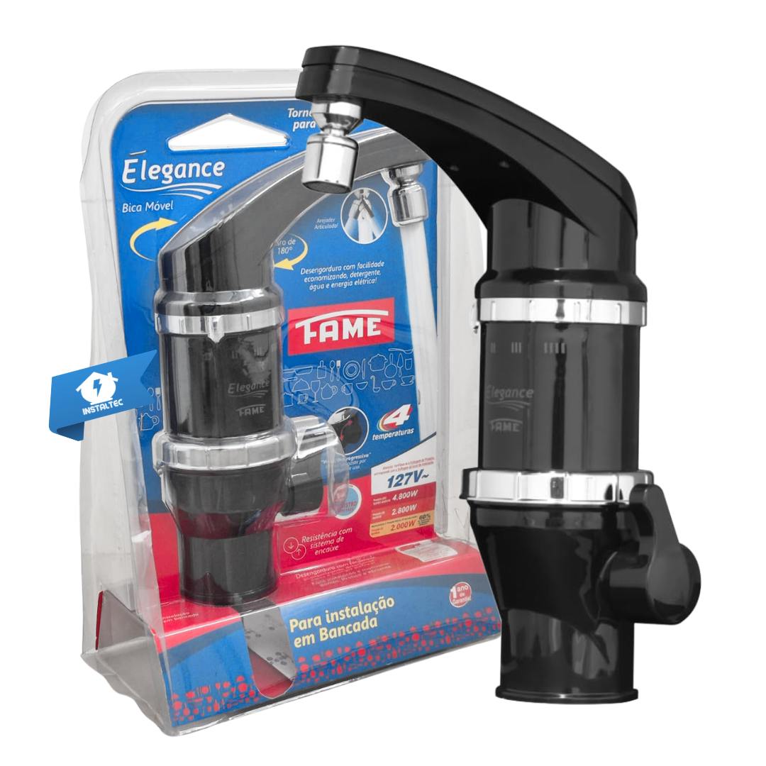 Com acabamento em preto elegante. a Torneira Elétrica Elegance valoriza cozinhas modernas. Seu bico móvel com arejador garante praticidade na direção do jato e economia de água. Os 4 níveis de temperatura permitem adaptar o uso em diferentes situações. seja para higienizar louças engorduradas. verduras ou até mesmo para maior conforto em dias frios. A troca da resistência tipo refil é prática. garantindo mais durabilidade e segurança ao produto.